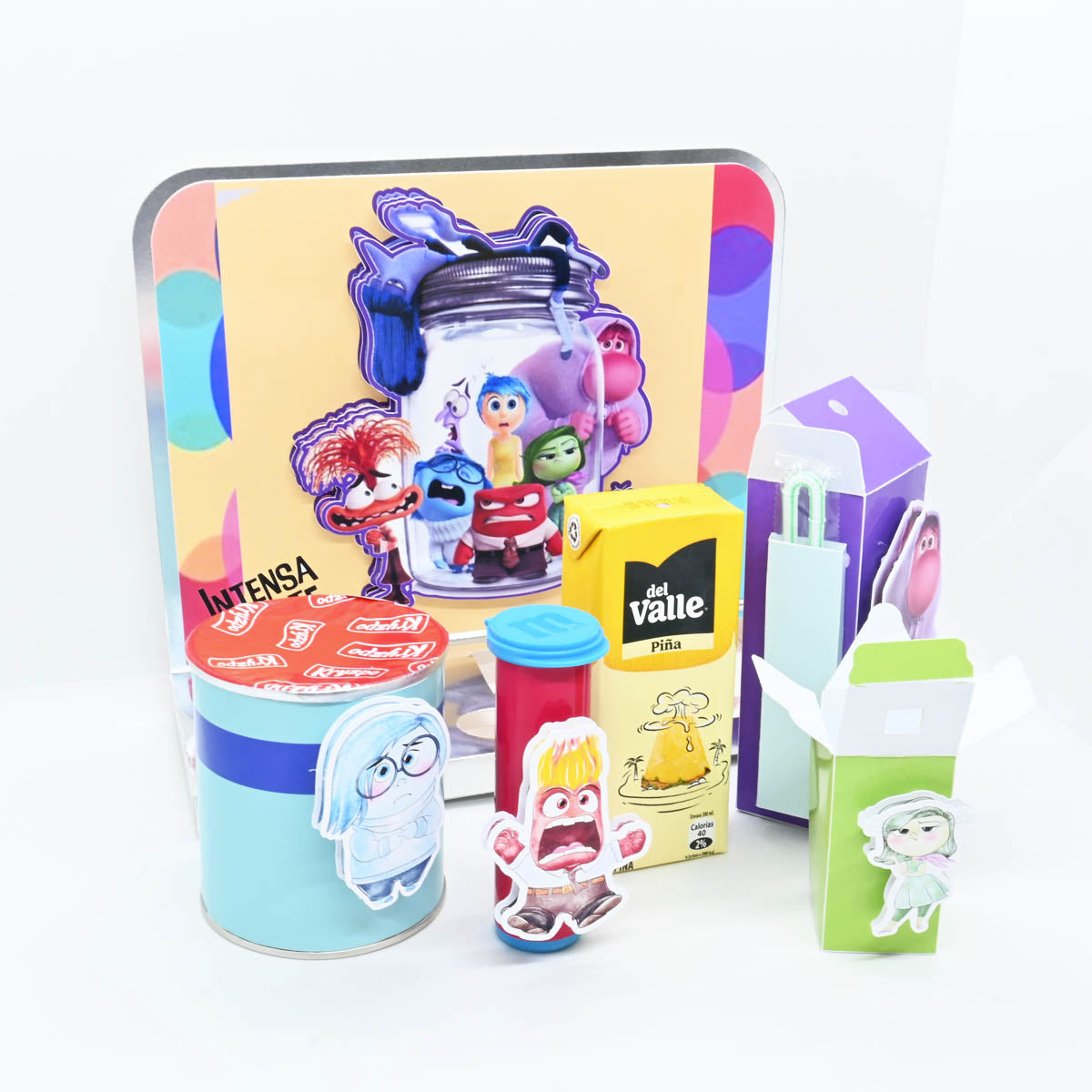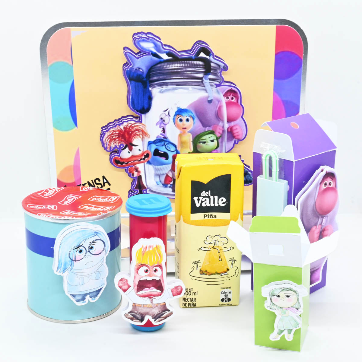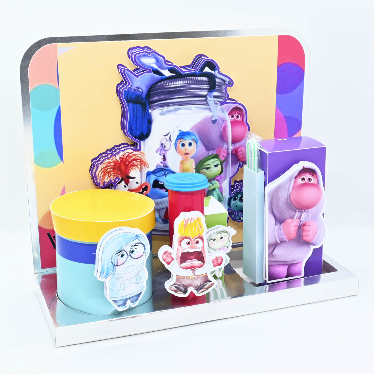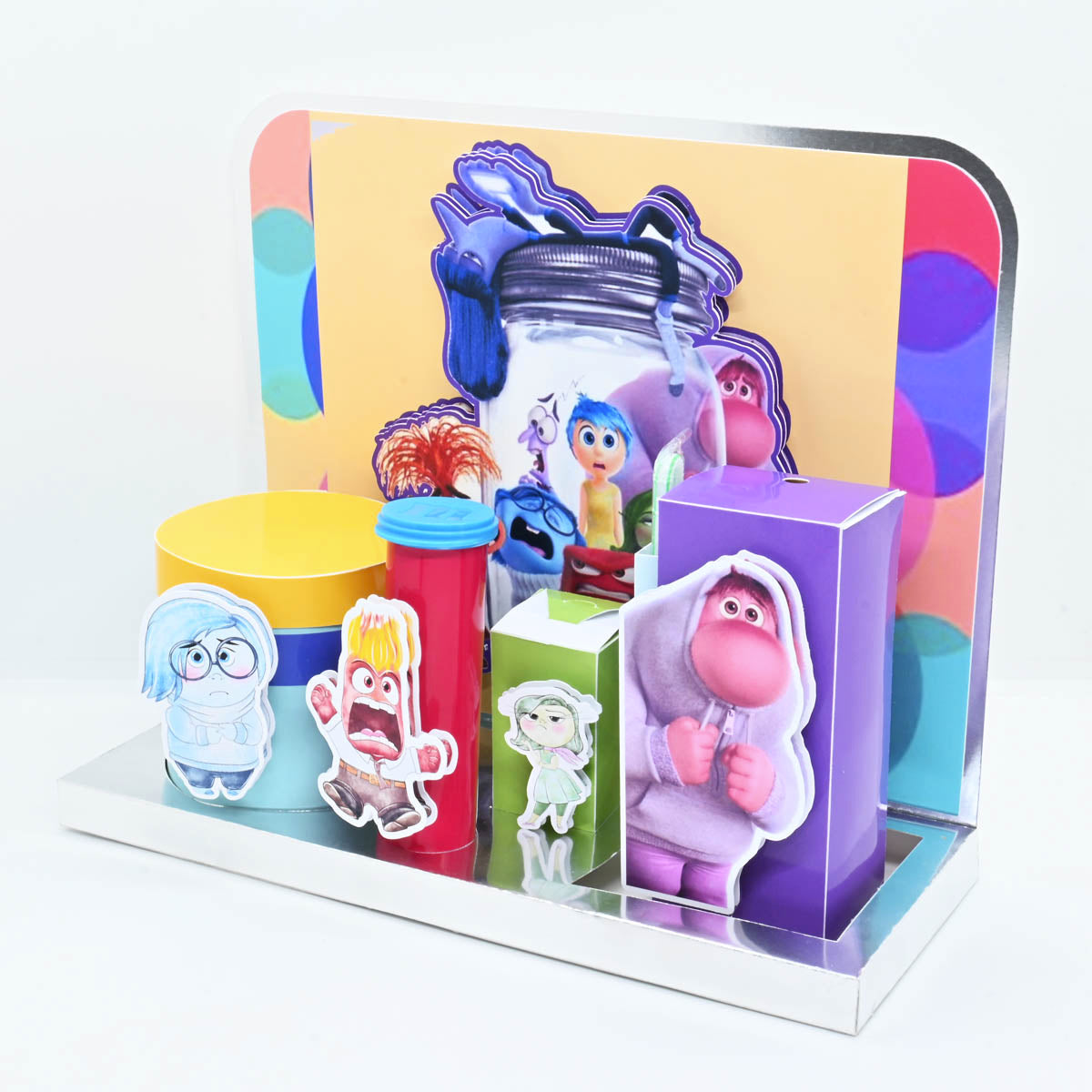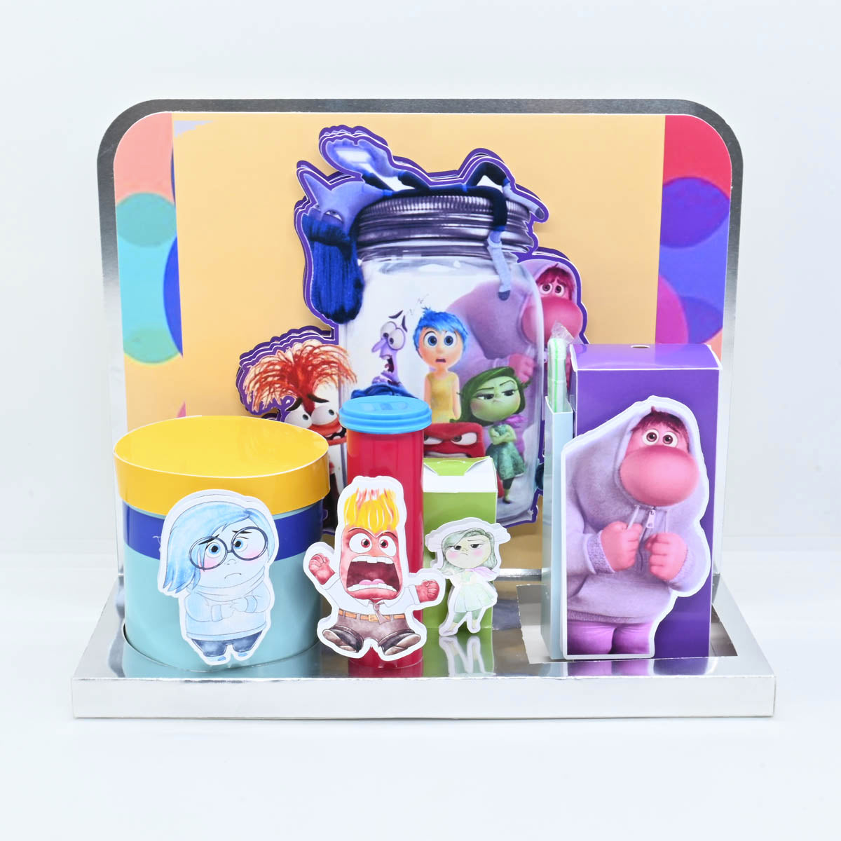 Escenario de golosinas para Niños tiene una temática de la película "Intensa-mente" .El modelo presenta varios elementos decorativos y empaques personalizados con los personajes de la película.