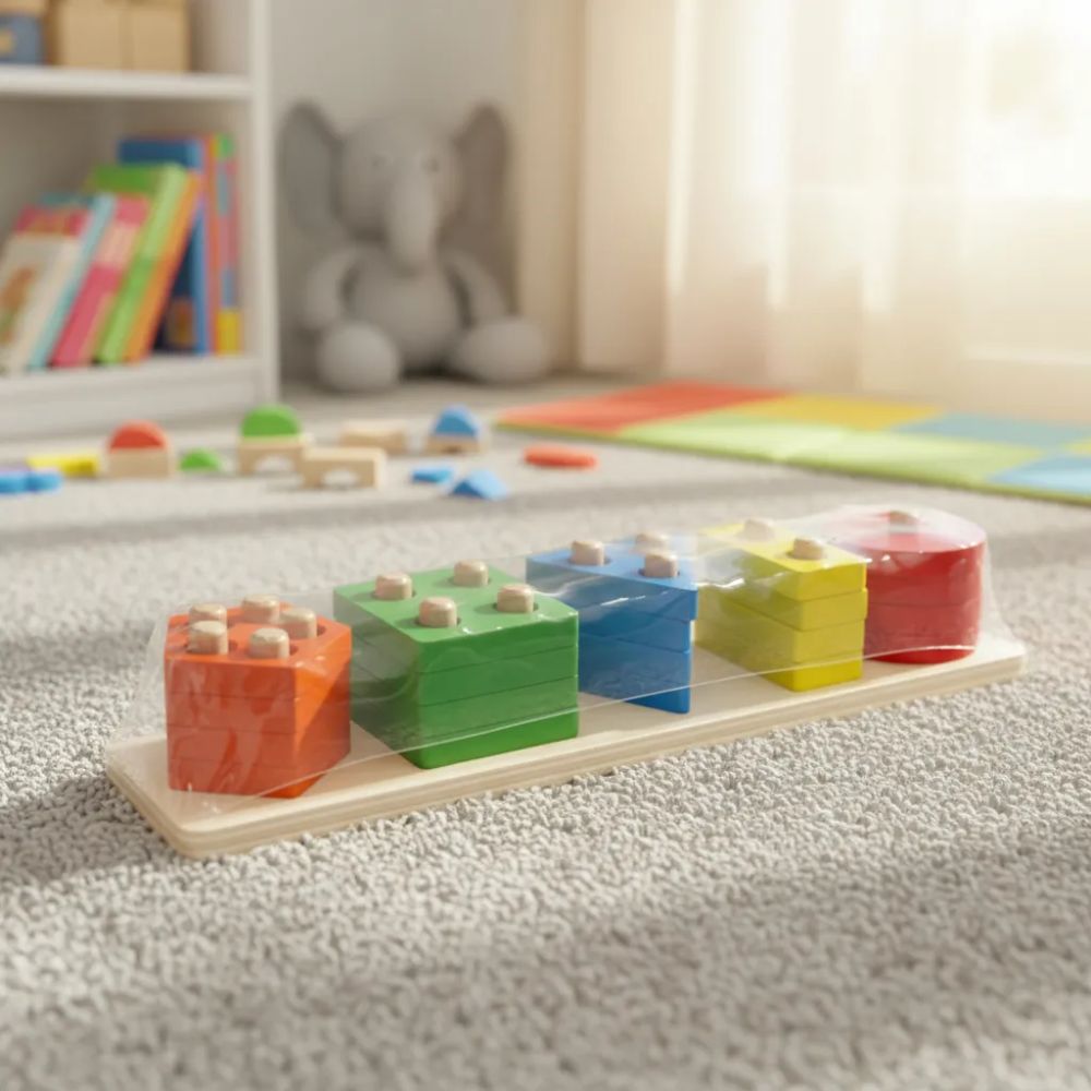 El Juego Encaje Geométrico 5 Columnas Colores de Madera es ideal para la estimulación temprana. Diseñado para que tu bebé aprenda jugando, favorece el desarrollo de la motricidad fina, la coordinación y el reconocimiento de formas y colores.